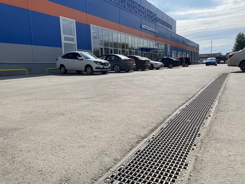 В работе использовались лотки, изготавливаемые нашей компанией. Они подобраны так, чтобы выдерживать вес транспортных средств, которые работают на территории объекта. Чтобы желоба, сформированные лотками, не засорялись мусором, а также чтобы они не представляли опасности для людей, сверху они накрыты металлическими решетками. Это решение также придает системе более завершенный вид, делает ее малозаметной, легко вписывающейся в окружающую обстановку.